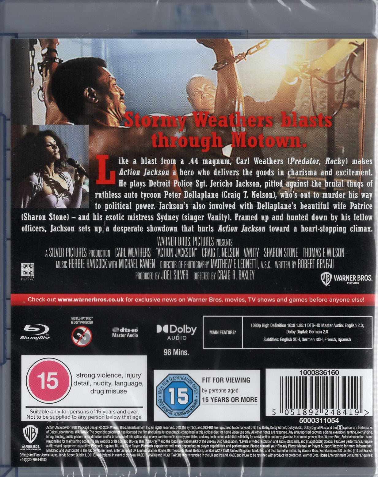 Like a blast from a .44 magnum, Carl Weathers (Predator, Rocky) makes Action Jackson a hero who delivers the goods with charisma and excitement. He plays Detroit police Sergeant Jericho Jackson, pitted against the brutal thugs of ruthless auto tycoon Peter Dellaplane (Craig T. Nelson), who’s out to murder his way to political power. Jackson’s also involved with Dellaplane’s beautiful wife, Patrice (Sharon Stone) – and his mistress, Sydney (singer Vanity). Framed and hunted by his fellow officers, Jackson sets up a desperate showdown that hurls Action Jackson toward a heart-stopping climax.